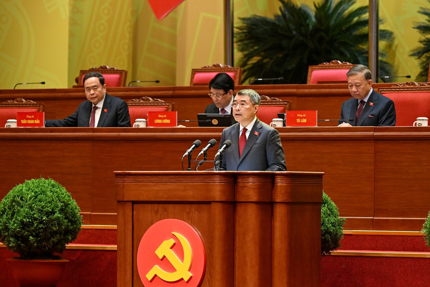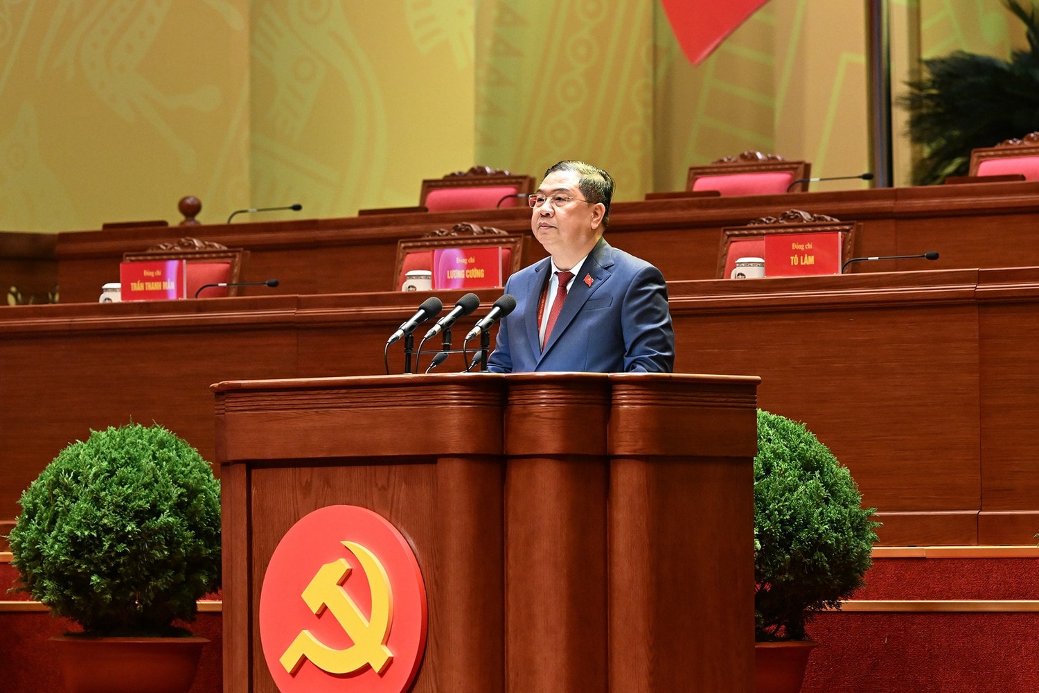 Đồng chí Phạm Gia Túc, Ủy viên Trung ương Đảng, Chánh Văn phòng Trung ương Đảng phát biểu, đề nghị Đại hội dành 1 phút mặc niệm tưởng nhớ cố Tổng Bí thư Nguyễn Phú Trọng và các đồng chí Ủy viên BCH TƯ khóa XIII đã từ trần trong nhiệm kỳ Đại hội XIII.
